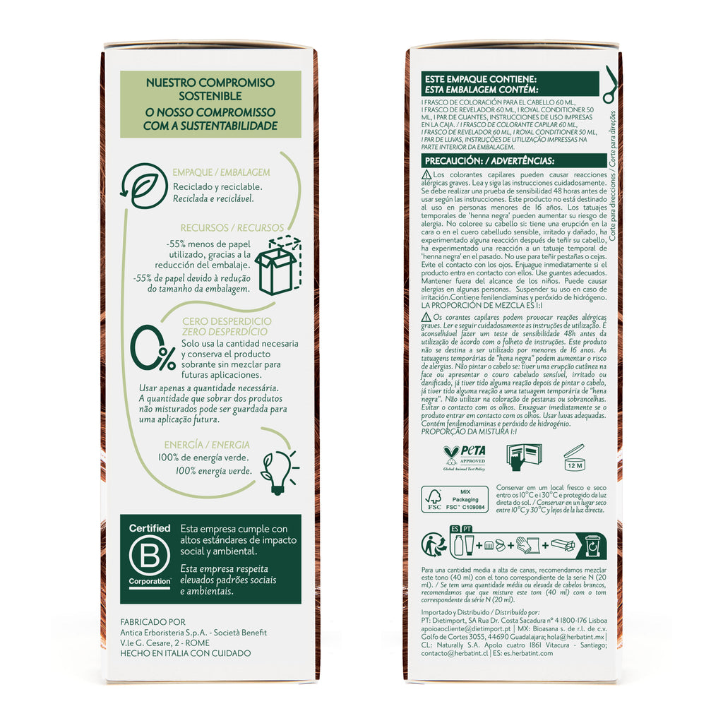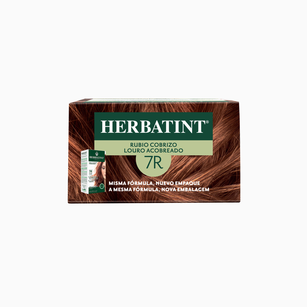 ¿Cómo aplicar la Tintura Permanente Natural 7R Rubio Cobrizo? Primero, usa un recipiente de plástico o cristal, combina una cantidad suficiente e igual de gel HERBATINT y de revelador de acuerdo con la longitud y volumen de tu cabello. Aplica la mezcla sobre el cabello seco, pero debes considerar que: Si tu cabello está previamente teñido, aplica la mezcla en la zona de las raíces y déjala actuar durante 30 minutos. Luego, aplica lo que queda de mezcla en el resto del cabello y espera otros 10 minutos. (Tiempo total de procesado: 40 minutos). Si tu cabello no está teñido, aplica la mezcla a lo largo de toda la longitud del cabello, comenzando por las raíces. Para una mejor cobertura, déjala actuar durante 40 minutos. Una vez terminado el proceso, lava el cabello de manera abundante hasta que el agua salga clara. Al finalizar, lava el cabello con el Shampoo y Acondicionador Herbatint.