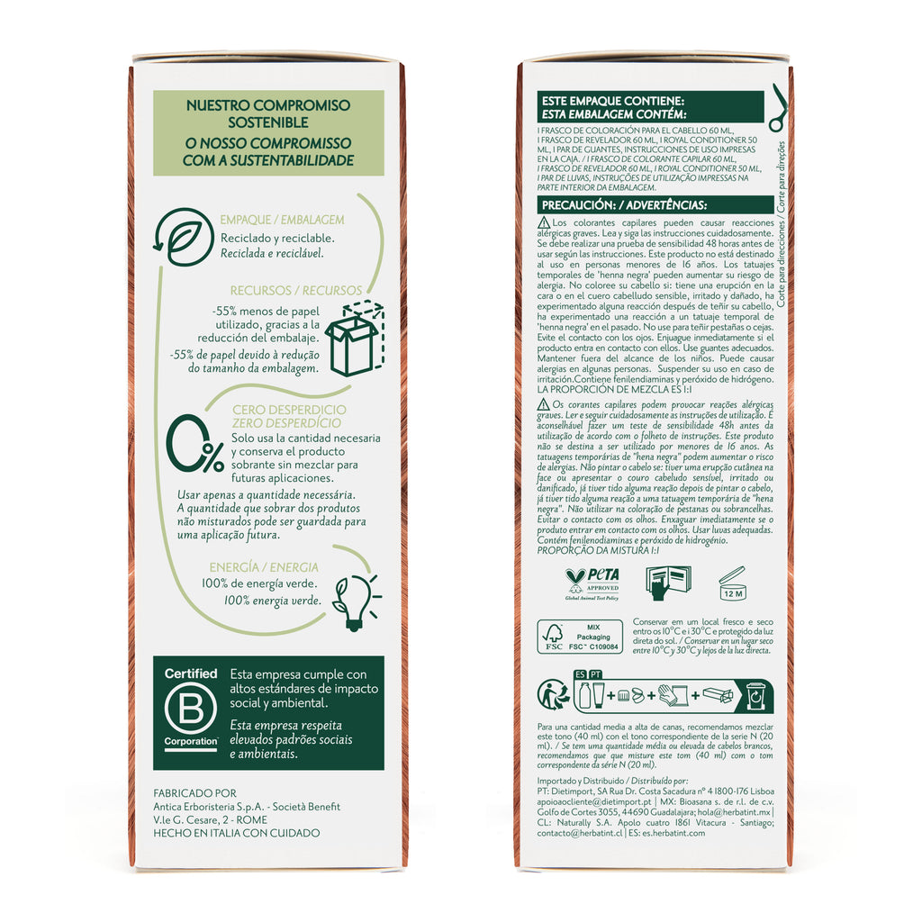 Es una tintura permanente natural que viene en un formato reciclable y reutilizable que trae un kit compuesto por: 1 tinte de pelo en gel de 60ml, 1 revelador de glicol de 60ml, 1 muestra de Acondicionador y de Shampoo de Aloe Vera (15 ml cada sachet), 1 par de guantes y 1 folleto con las instrucciones de uso.