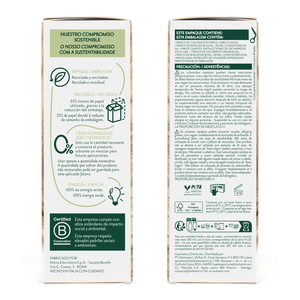 Las tinturas permanentes de la categoría Naturales (con la letra N) de Herbatint se caracterizan por nutrir, acondicionar y proteger cada hebra del cabello y, además, el cuero cabelludo. Estas tinturas tienen un 100% de cobertura de canas y pueden lograr un aclarado de tu cabello hasta dos tonos superiores. Ejemplo: si tu cabello originalmente es castaño en la altura del 5N, al utilizar una 7N quedará mucho más iluminado, sedoso y natural, si eliges un tono superior, quedará con reflejos brillantes, pero no completamente aclarado.